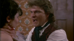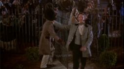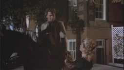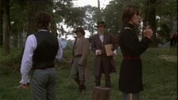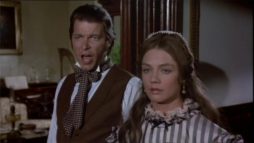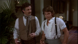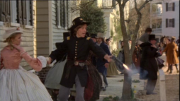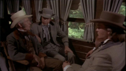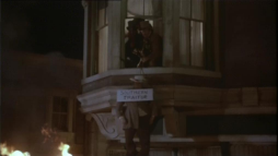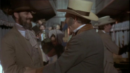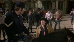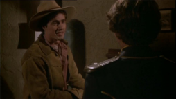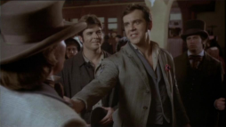 (3) Director's error: When Billy and Brett run from the street gang, they turn into a narrow passage between two houses clad in yellow painted wooden boards. In the next camera view, now there is a white fence instead of one of the houses. Also, the covered wagon on the main street in the background wasn't there before.