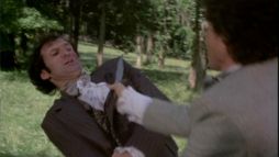 Billy............................. It's the cadets at the citadel, it's just a salut. (they walk through the crowds) Excuse me. ... Don't seem to be too friendly. ... Excuse me. (halted up by four bandits, to Brett) Stay with me.