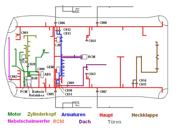 Beginnend mit C800 verläuft dieser Motor-spezifische Kabelbaum zum Motor und erreicht dort fast alle Elemente der Motorsteuerung. Benzinmotoren haben über den Stecker C820 (Duratec-16V) bzw. C821 (Duratec-8V) einen separaten Abzweig zum Zylinderkopf.